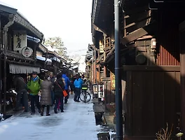 아침에는 조금 흐린 날씨에 눈발도 조금 흩날렸는데 타카야마 진야 앞에 도착할 즈음에는 해가 나와서 눈이 부셨다.